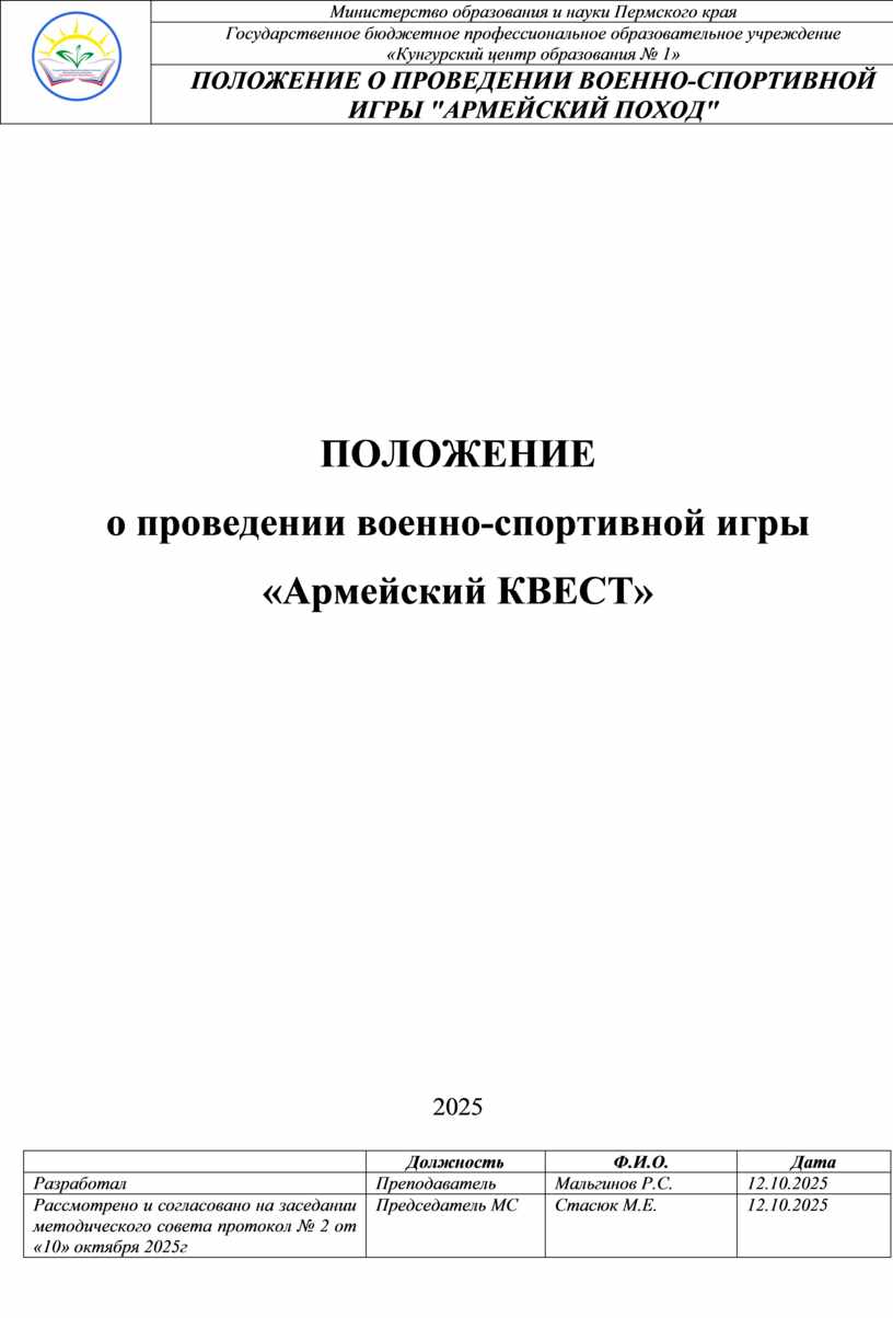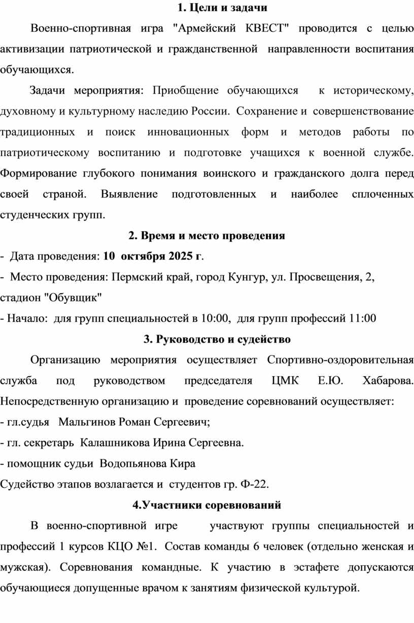 Военно-спортивная игра "Армейский КВЕСТ" проводится с целью активизации патриотической и гражданственной направленности воспитания обучающихся.