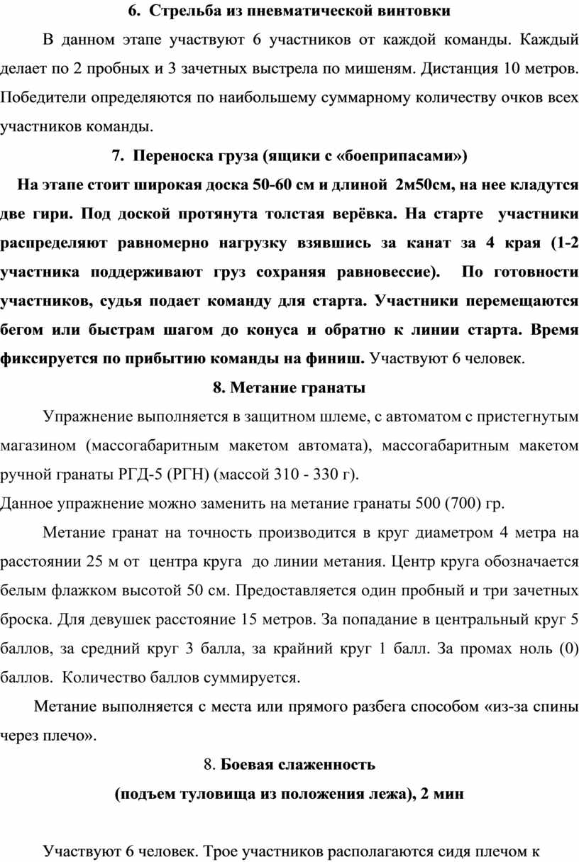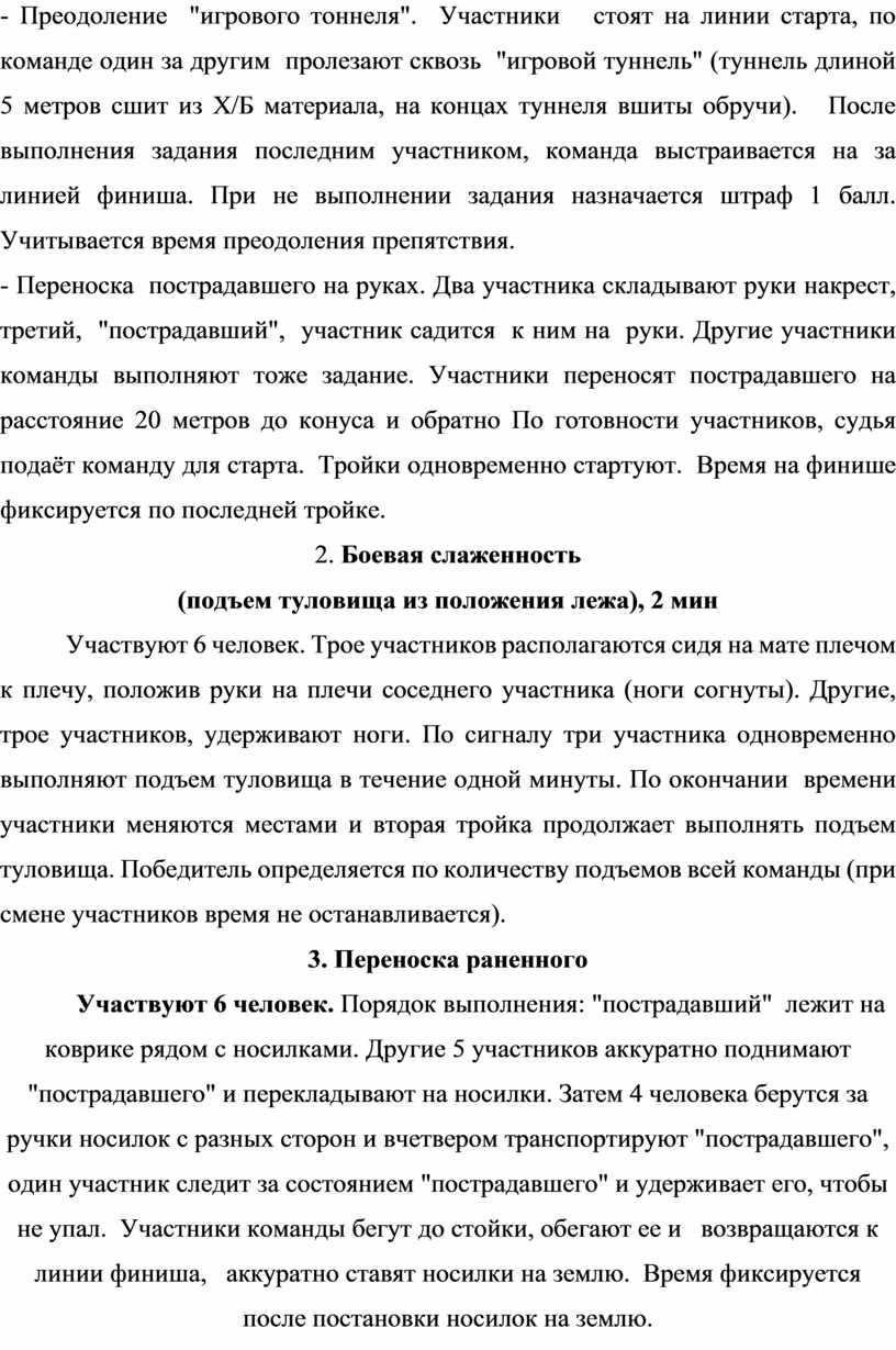 1. Полоса препятствий "Марш-бросок" (прохождение по рукоходу, преодоление барьеров (5 шт), переступание по кирпичикам (6 шт), проползание по пластунски через "туннель". Учитывается время выполнения.