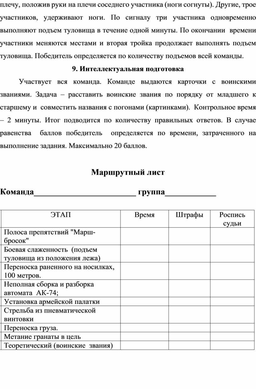 Участвует вся команда. Команде выдаются карточки с воинскими званиями. Задача – расставить воинские звания по порядку от младшего к старшему и совместить названия с погонами (картинками). Контрольное время – 2 минуты. Итог подводится по количеству правильных ответов. В случае равенства баллов победитель определяется по времени, затраченного на выполнение задания. Максимально 20 баллов.
