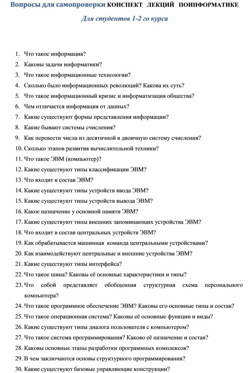 Вопросы для самопроверки КОНСПЕКТ ЛЕКЦИЙ ПО ИНФОРМАТИКЕ