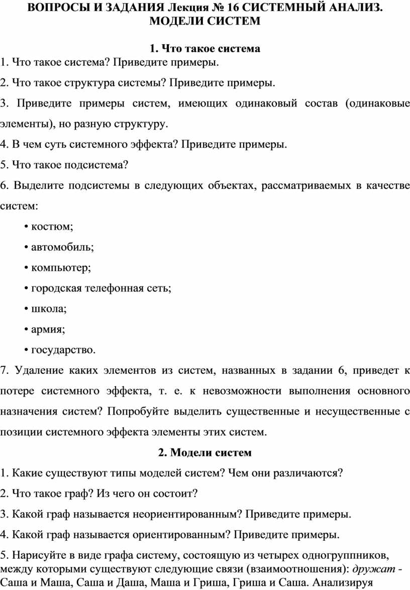 ВОПРОСЫ И ЗАДАНИЯ Лекция № 16 СИСТЕМНЫЙ АНАЛИЗ. МОДЕЛИ СИСТЕМ