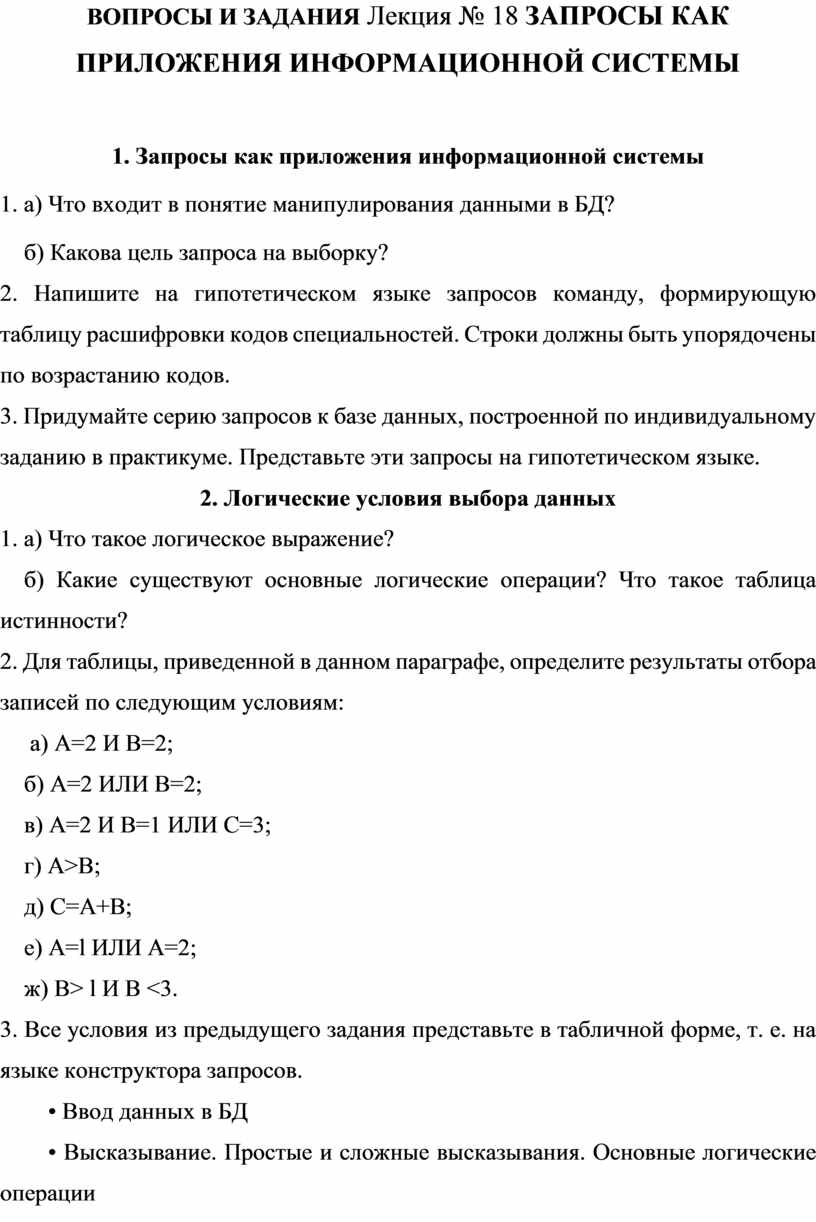 ВОПРОСЫ И ЗАДАНИЯ Лекция № 18 ЗАПРОСЫ КАК ПРИЛОЖЕНИЯ ИНФОРМАЦИОННОЙ СИСТЕМЫ