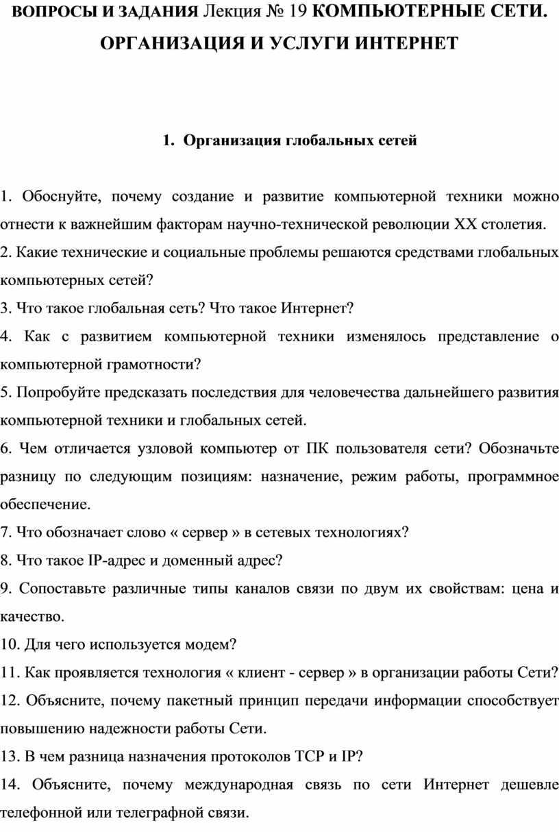 ВОПРОСЫ И ЗАДАНИЯ Лекция № 19 КОМПЬЮТЕРНЫЕ СЕТИ. ОРГАНИЗАЦИЯ И УСЛУГИ ИНТЕРНЕТ