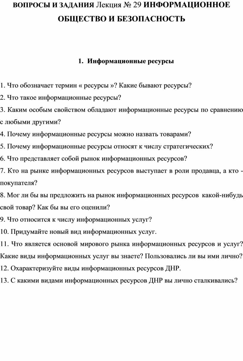ВОПРОСЫ И ЗАДАНИЯ Лекция № 29 ИНФОРМАЦИОННОЕ ОБЩЕСТВО И БЕЗОПАСНОСТЬ