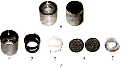 Рис. 89. Аэратор: а — общим вид; б — составные части: 1 — корпус; 2 — стакан; 3 — рассекатель: 4 — металлические сетки; 5 — резиновая прокладка