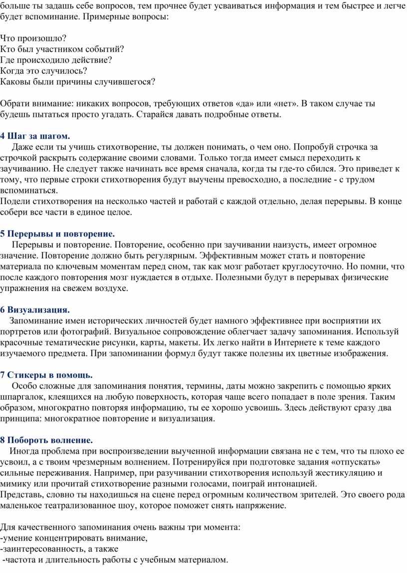 информация и тем быстрее и легче будет вспоминание. Примерные вопросы: