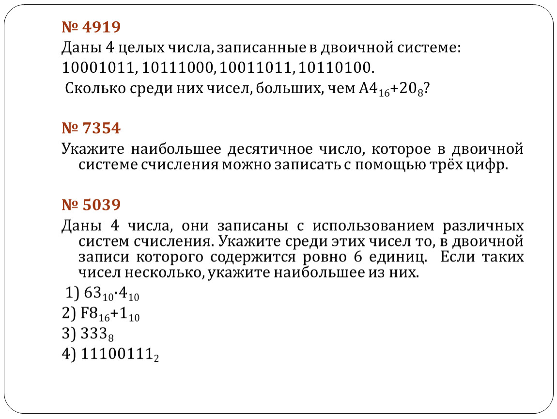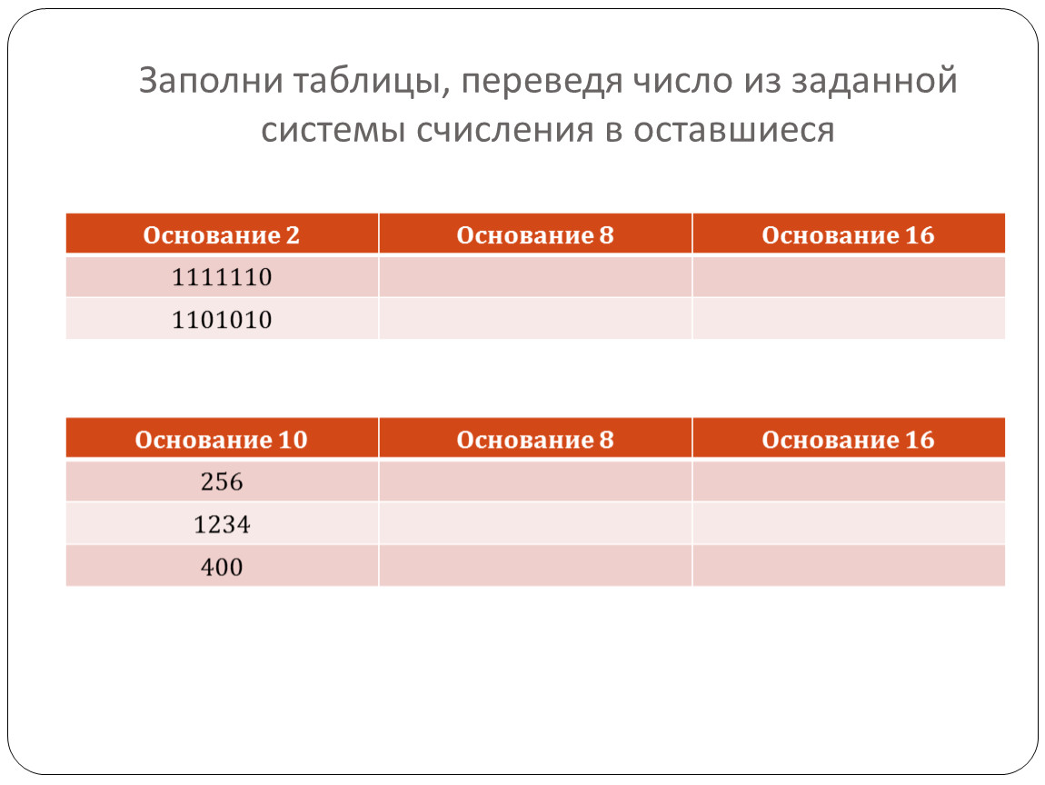 Заполни таблицы, переведя число из заданной системы счисления в оставшиеся