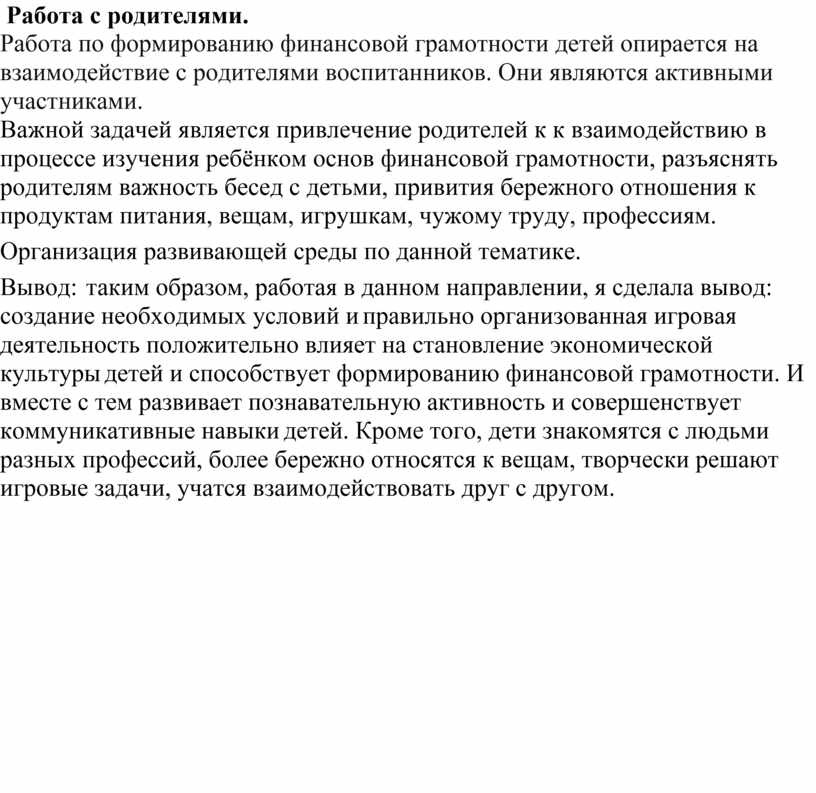 Важной задачей является привлечение родителей к к взаимодействию в процессе изучения ребёнком основ финансовой грамотности, разъяснять родителям важность бесед с детьми, привития бережного отношения к продуктам питания, вещам, игрушкам, чужому труду, профессиям.