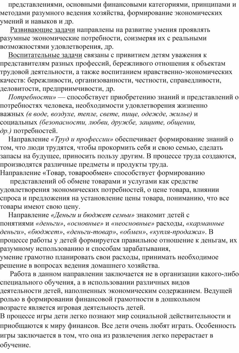 представлениями, основными финансовыми категориями, принципами и методами разумного ведения хозяйства, формирование экономических умений и навыков и др.