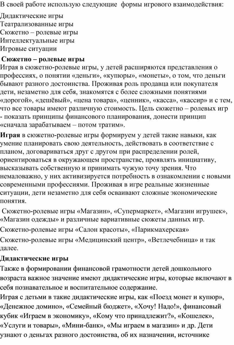 Работа в данном направлении заключается не в организации какого-либо специального обучения, а в использовании различных видов деятельности детей, наполненных экономическим содержанием. Ведущей ролью в формировании финансовой грамотности в дошкольном возрасте является игровая деятельность детей.