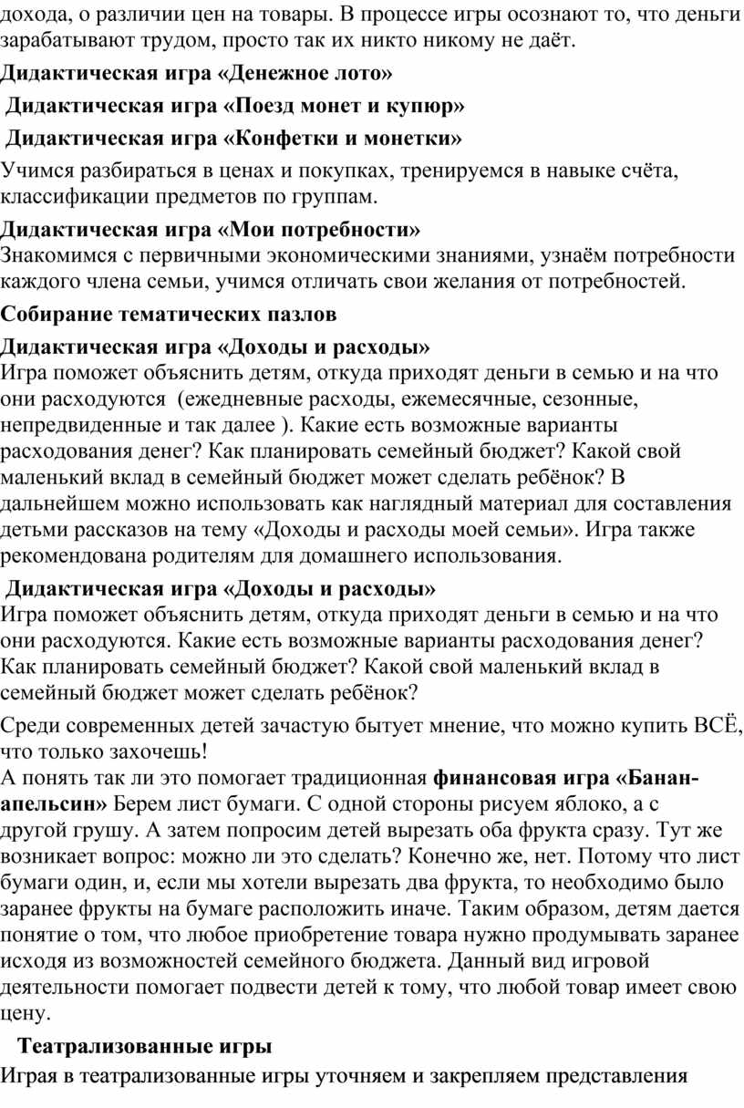 бюджета. Данный вид игровой деятельности помогает подвести детей к тому, что