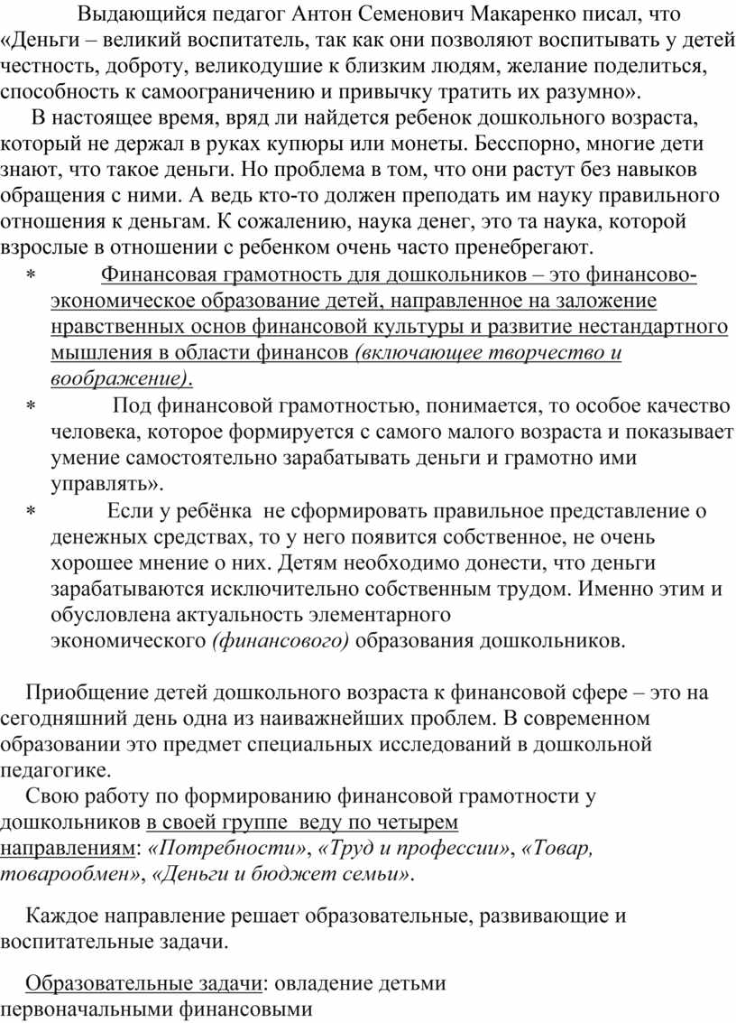 Выдающийся педагог Антон Семенович Макаренко писал, что «Деньги – великий воспитатель, так как они позволяют воспитывать у детей честность, доброту, великодушие к близким людям, желание поделиться, способность к самоограничению и привычку тратить их разумно».