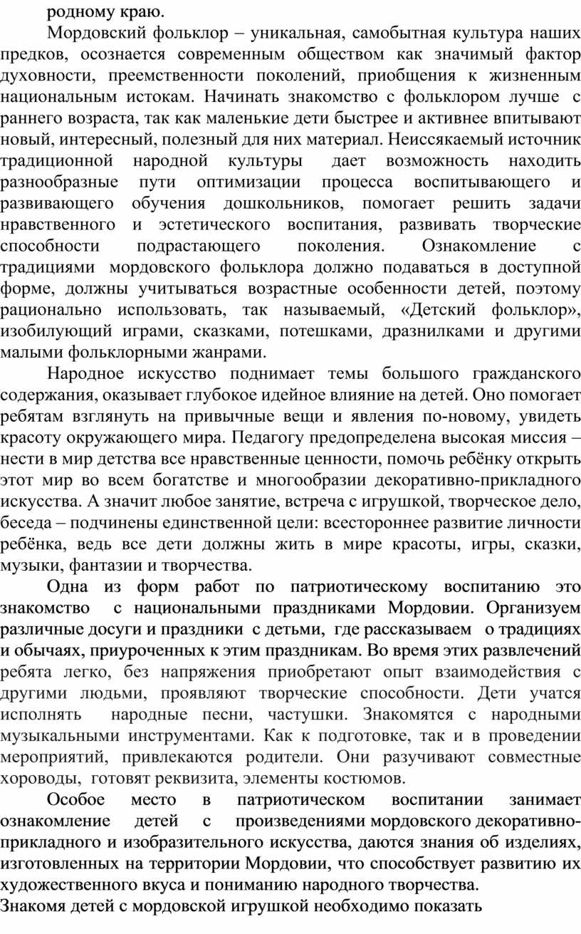ВОСПИТАНИЕ ПАТРИОТИЗМА У ДЕТЕЙ ДОШКОЛЬНОГО ВОЗРАСТА ЧЕРЕЗ ПРИОБЩЕНИЕ К МОРДОВСКОЙ КУЛЬТУРЕ И ТРАДИЦИЯМ