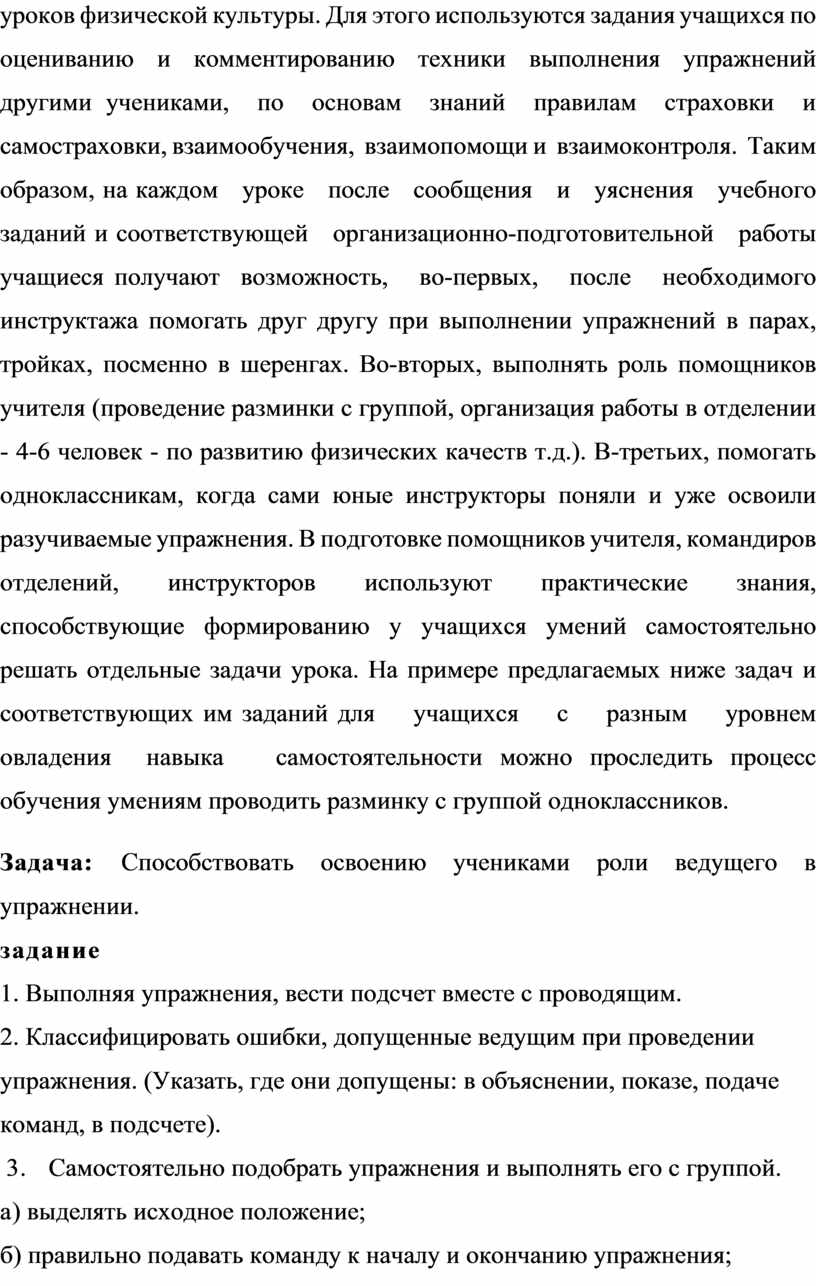Важной предпосылкой эффективностью обучения учащихся считаю последовательную работу под усилением инструктивной направленности уроков физической культуры. Для этого используются задания учащихся по оцениванию и комментированию техники выполнения упражнений другими учениками, по основам знаний правилам страховки и самостраховки, взаимообучения, взаимопомощи и взаимоконтроля. Таким образом, на каждом уроке после сообщения и уяснения учебного заданий и соответствующей организационно-подготовительной работы учащиеся получают возможность, во-первых, после необходимого инструктажа помогать друг другу при выполнении упражнений в парах, тройках, посменно в шеренгах. Во-вторых, выполнять роль помощников учителя (проведение разминки с группой, организация работы в отделении - 4-6 человек - по развитию физических качеств т.д.). В-третьих, помогать одноклассникам, когда сами юные инструкторы поняли и уже освоили разучиваемые упражнения. В подготовке помощников учителя, командиров отделений, инструкторов используют практические знания, способствующие формированию у учащихся умений самостоятельно решать отдельные задачи урока. На примере предлагаемых ниже задач и соответствующих им заданий для учащихся с разным уровнем овладения навыка самостоятельности можно проследить процесс обучения умениям проводить разминку с группой одноклассников.