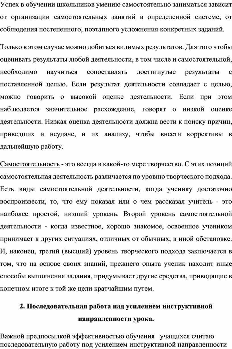 Самостоятельность - это всегда в какой-то мере творчество. С этих позиций самостоятельная деятельность различается по уровню творческого подхода. Есть виды самостоятельной деятельности, когда ученику достаточно воспроизвести, то, что ему показал или о чем рассказал учитель - это наиболее простой, низший уровень. Второй уровень самостоятельной деятельности - когда известное, хорошо знакомое, освоенное учеником принимает в других ситуациях, отличных от обычных, в иной обстановке. И, наконец, третий (высший) уровень творческого подхода заключается в том, что на основе своих знаний, прежнего опыта ученик находит иные способы выполнения задания, придумывает другие средства, приводящие в конечном итоге к той же цели кратчайшим путем.