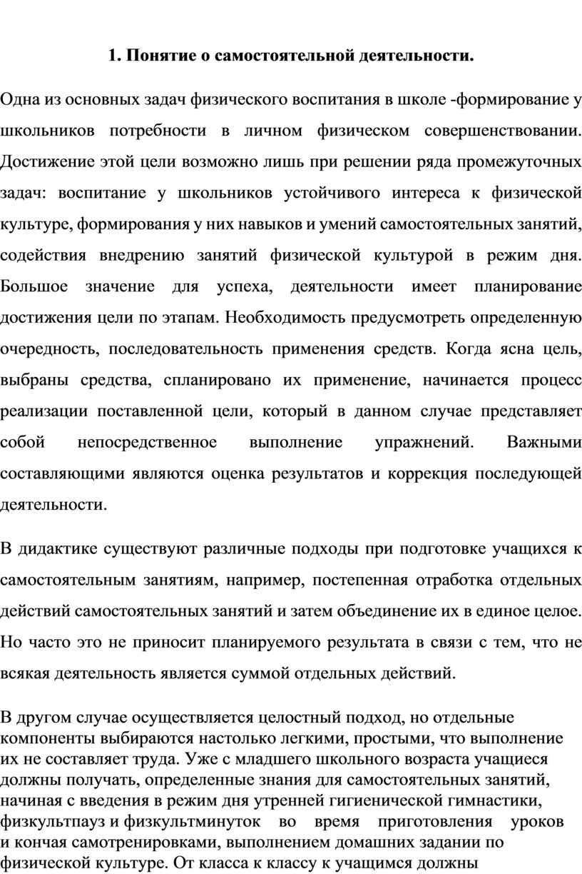 Навыки и умения самостоятельных занятий, представленные в школьной программе, соответствуют возрастным возможностям учащихся к самостоятельной работе. Другим важным условием является доступность конкретных заданий для каждого школьника. Особое значение в самостоятельной работе приобретает принцип сознательности при её выполнении. Подготовка учащихся к самостоятельным занятиям должна начинаться с чёткого немногословного инструктирования школьников о цели и задачах конкретных самостоятельных занятий, постепенного вооружения знаниями о системе самотренировок, привития необходимых технических и организационных навыков. С первых же занятий нужно требовать от учащихся соблюдения дозировки времени и нагрузки, обязательным компонентом обучения является систематическая проверка даваемых школьникам заданий. Другим важным моментом является выработка у ребят простейших приемов самоконтроля за реакцией своего организма на нагрузку.