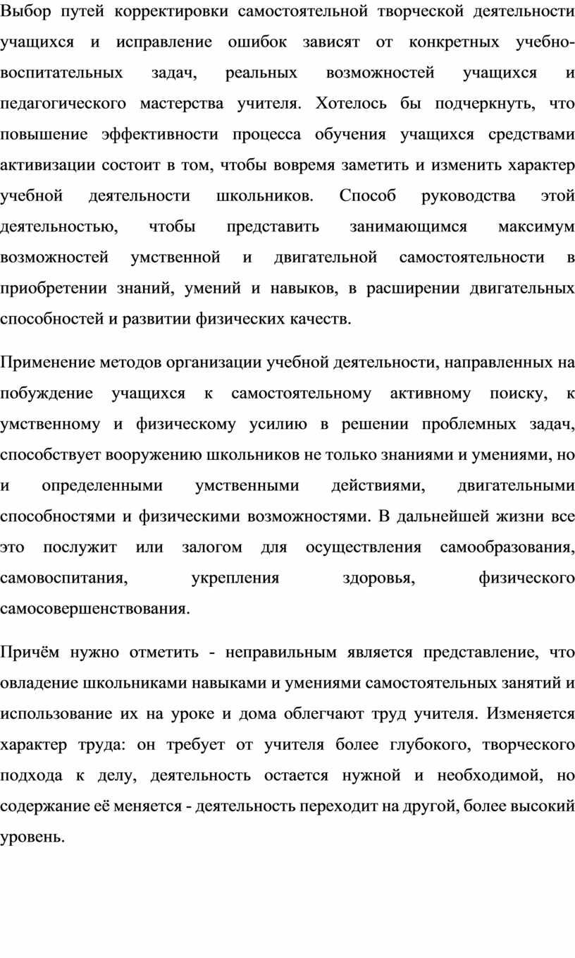 Выбор путей корректировки самостоятельной творческой деятельности учащихся и исправление ошибок зависят от конкретных учебно-воспитательных задач, реальных возможностей учащихся и педагогического мастерства учителя. Хотелось бы подчеркнуть, что повышение эффективности процесса обучения учащихся средствами активизации состоит в том, чтобы вовремя заметить и изменить характер учебной деятельности школьников. Способ руководства этой деятельностью, чтобы представить занимающимся максимум возможностей умственной и двигательной самостоятельности в приобретении знаний, умений и навыков, в расширении двигательных способностей и развитии физических качеств.