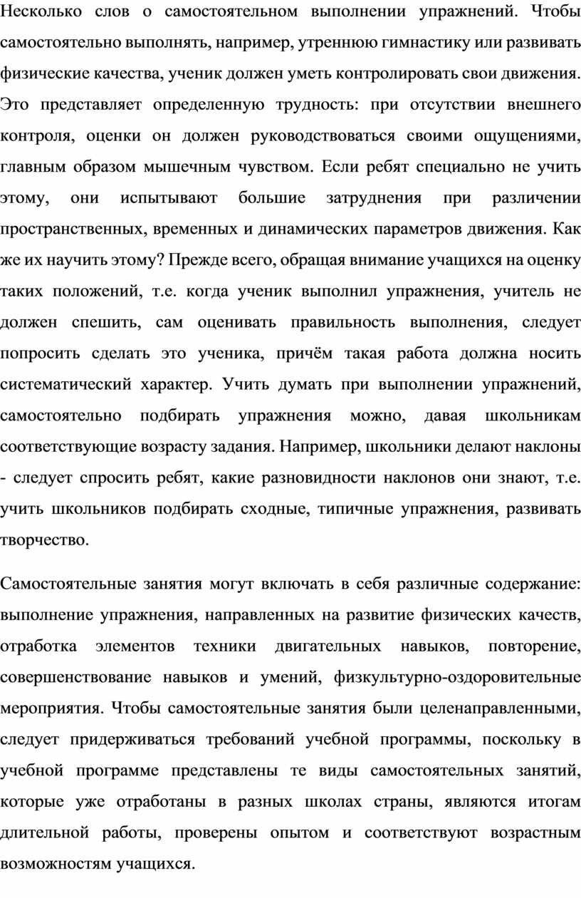 Несколько слов о самостоятельном выполнении упражнений. Чтобы самостоятельно выполнять, например, утреннюю гимнастику или развивать физические качества, ученик должен уметь контролировать свои движения. Это представляет определенную трудность: при отсутствии внешнего контроля, оценки он должен руководствоваться своими ощущениями, главным образом мышечным чувством. Если ребят специально не учить этому, они испытывают большие затруднения при различении пространственных, временных и динамических параметров движения. Как же их научить этому? Прежде всего, обращая внимание учащихся на оценку таких положений, т.е. когда ученик выполнил упражнения, учитель не должен спешить, сам оценивать правильность выполнения, следует попросить сделать это ученика, причём такая работа должна носить систематический характер. Учить думать при выполнении упражнений, самостоятельно подбирать упражнения можно, давая школьникам соответствующие возрасту задания. Например, школьники делают наклоны - следует спросить ребят, какие разновидности наклонов они знают, т.е. учить школьников подбирать сходные, типичные упражнения, развивать творчество.