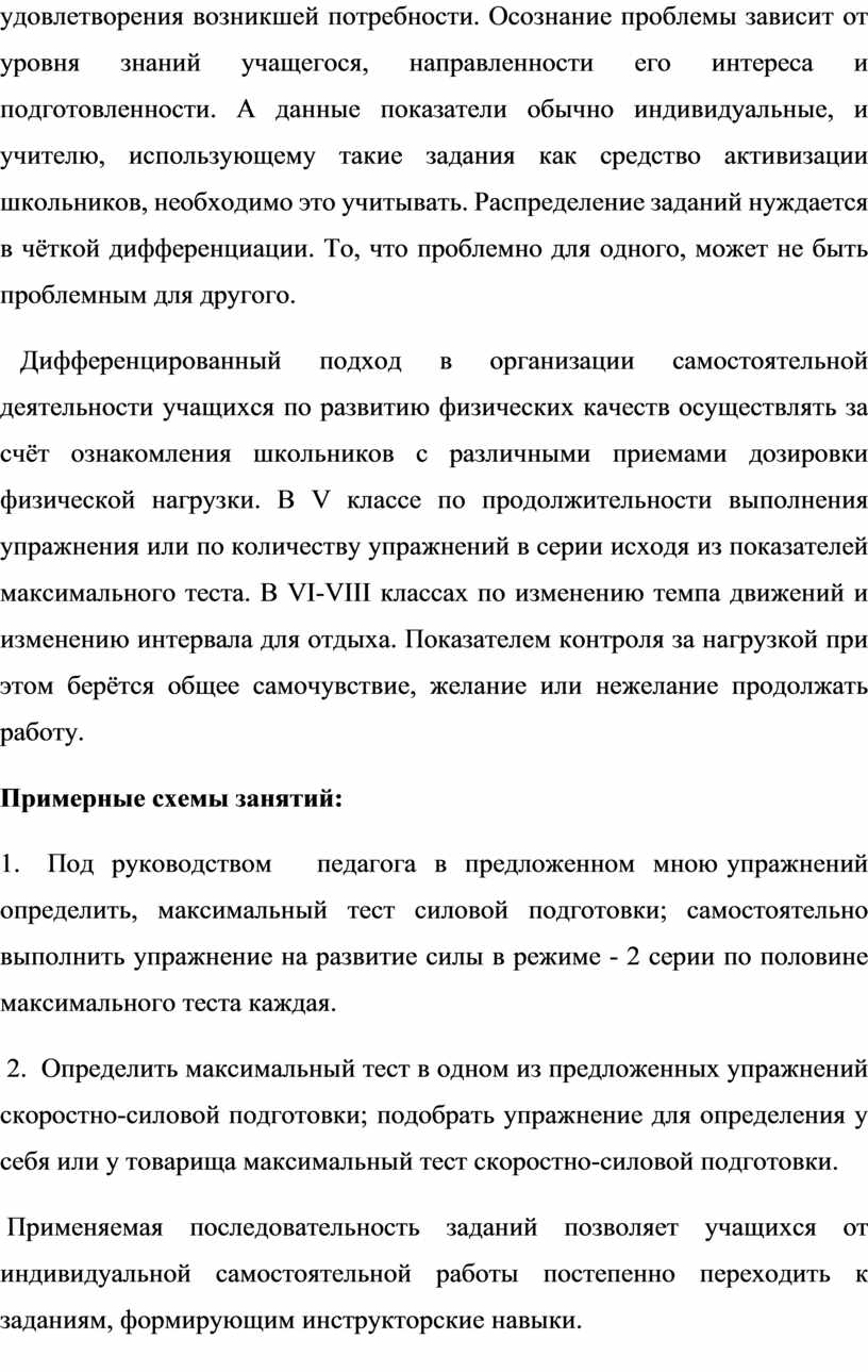 Дифференцированный подход в организации самостоятельной деятельности учащихся по развитию физических качеств осуществлять за счёт ознакомления школьников с различными приемами дозировки физической нагрузки. В V классе по продолжительности выполнения упражнения или по количеству упражнений в серии исходя из показателей максимального теста. В VI-VIII классах по изменению темпа движений и изменению интервала для отдыха. Показателем контроля за нагрузкой при этом берётся общее самочувствие, желание или нежелание продолжать работу.