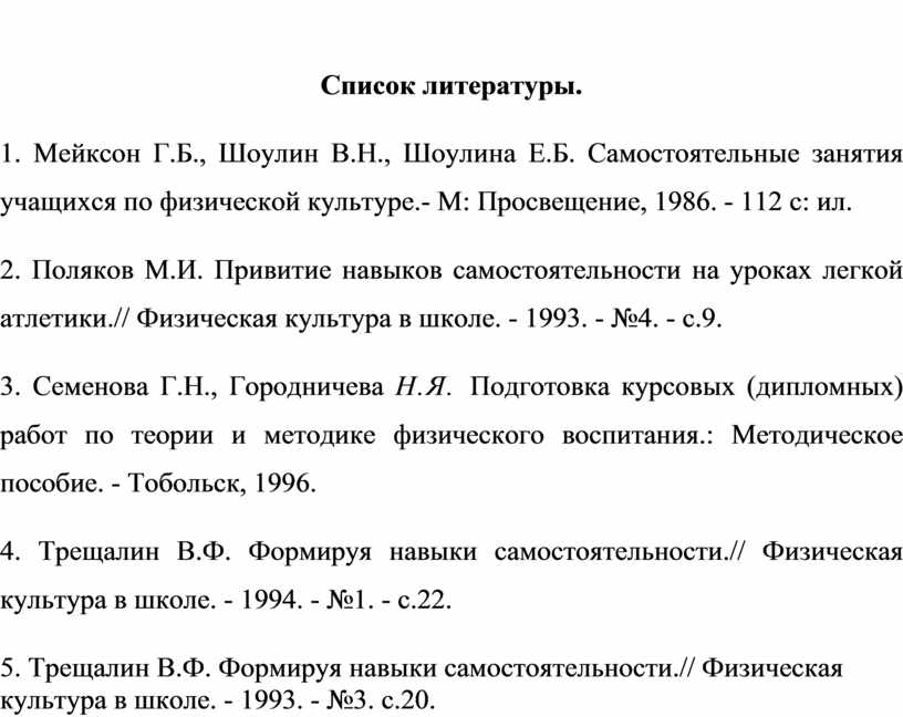 5. Трещалин В.Ф. Формируя навыки самостоятельности.// Физическая культура в школе. - 1993. - №3. с.20.