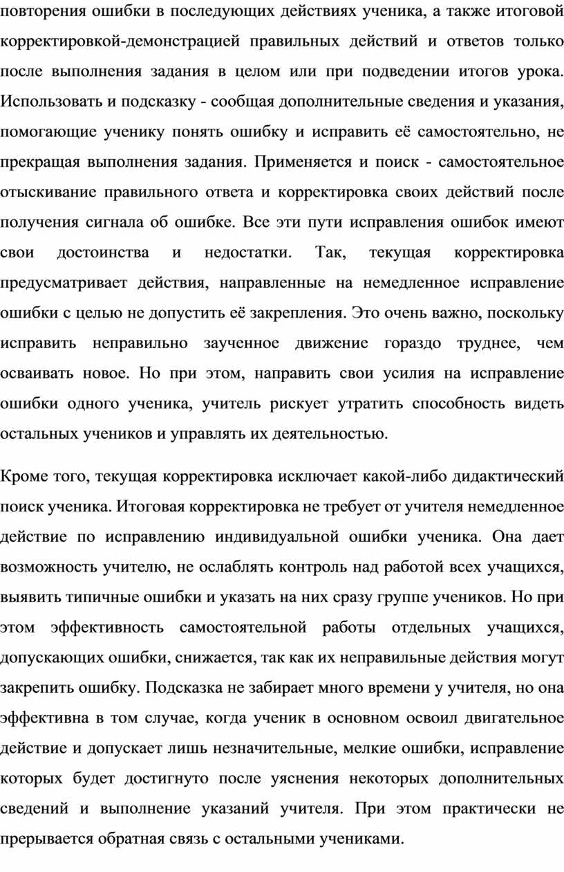 Кроме того, текущая корректировка исключает какой-либо дидактический поиск ученика. Итоговая корректировка не требует от учителя немедленное действие по исправлению индивидуальной ошибки ученика. Она дает возможность учителю, не ослаблять контроль над работой всех учащихся, выявить типичные ошибки и указать на них сразу группе учеников. Но при этом эффективность самостоятельной работы отдельных учащихся, допускающих ошибки, снижается, так как их неправильные действия могут закрепить ошибку. Подсказка не забирает много времени у учителя, но она эффективна в том случае, когда ученик в основном освоил двигательное действие и допускает лишь незначительные, мелкие ошибки, исправление которых будет достигнуто после уяснения некоторых дополнительных сведений и выполнение указаний учителя. При этом практически не прерывается обратная связь с остальными учениками.