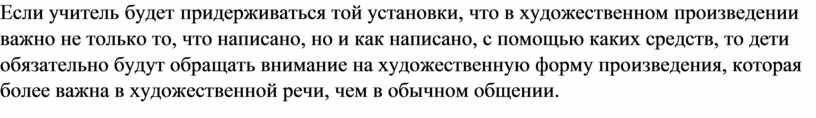 Если учитель будет придерживаться той установки, что в художественном произведении важно не только то, что написано, но и как написано, с помощью каких средств, то дети обязательно будут обращать внимание на художественную форму произведения, которая более важна в художественной речи, чем в обычном общении.