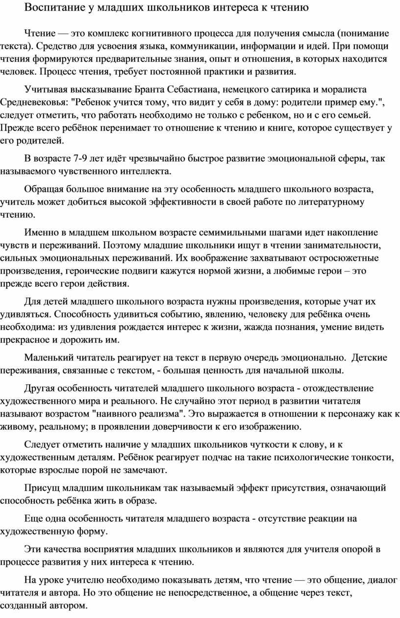 Воспитание у младших школьников интереса к чтению