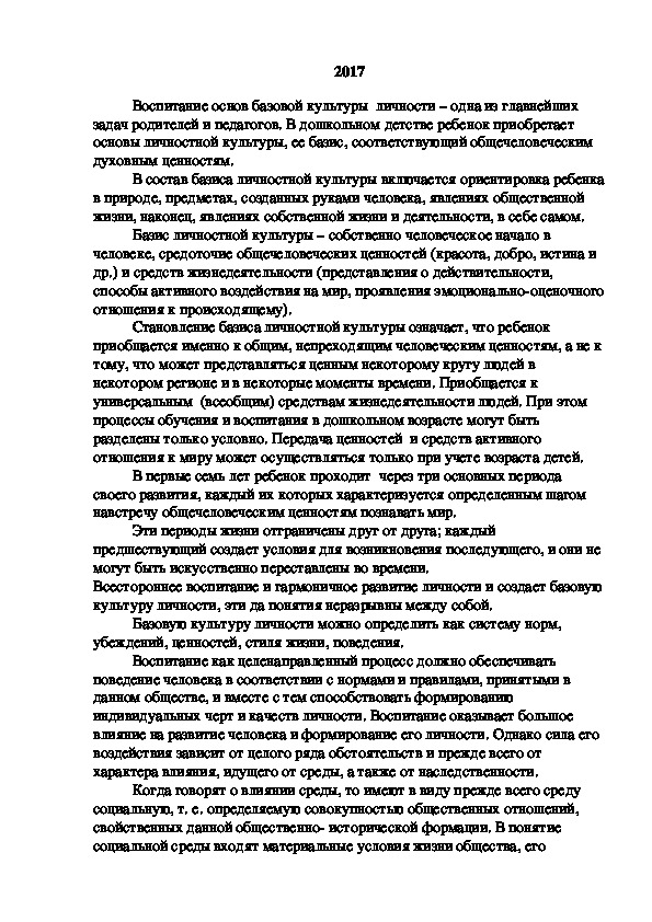 Воспитание основ базовой культуры личности – одна из главнейших задач родителей и педагогов. В дошкольном детстве ребенок приобретает основы личностной культуры, ее базис, соответствующий общечеловеческим духовным ценностям.