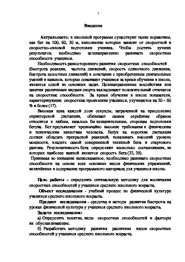Актуальность: в школьной программе существуют такие нормативы, как бег на 100, 60, 30 м, выполнение которых зависит от скоростной и скоростно–силовой подготовки ученика. Чтобы достичь лучших результатов, необходимо целенаправленно развивать скоростные способности учащихся.