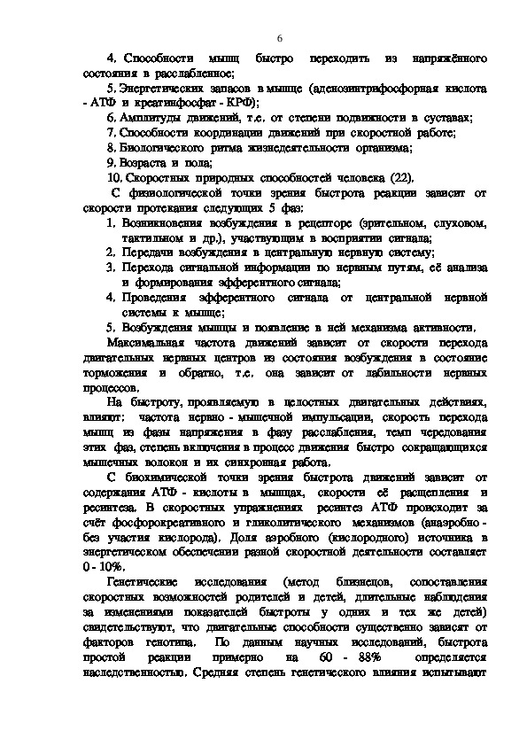 (быстрота реакции, частота движений, скорость одиночного движения, быстрота целостных движений) в сочетании с приобретением двигательных умений и навыков, которые осваивают учащиеся за время обучения в школе, является одной из основных задач. Целенаправленные воздействия или занятия различными видами спорта накладывают положительный отпечаток на скоростные способности. За время обучения в школе показатели, характеризующие скоростные проявления учащихся, улучшаются на 20 – 60 % и более (17).