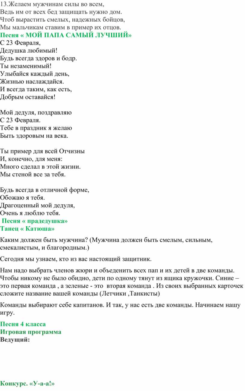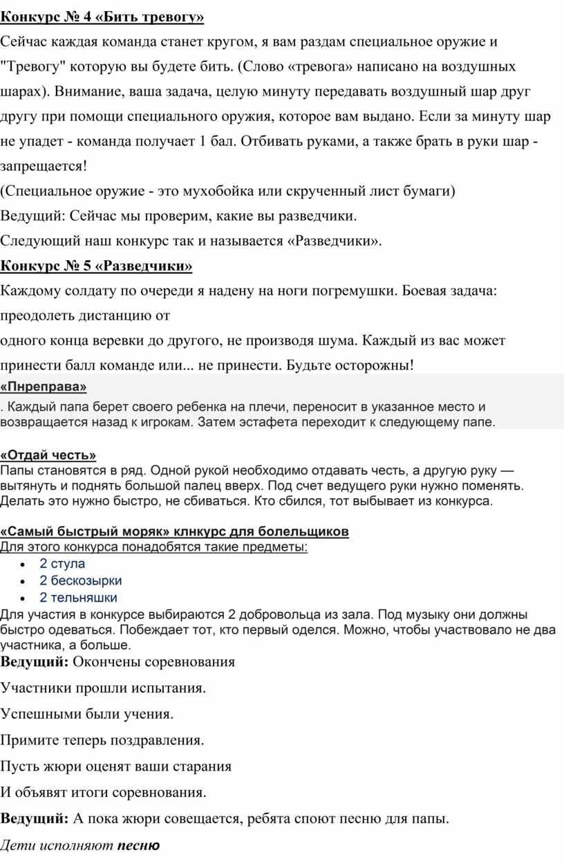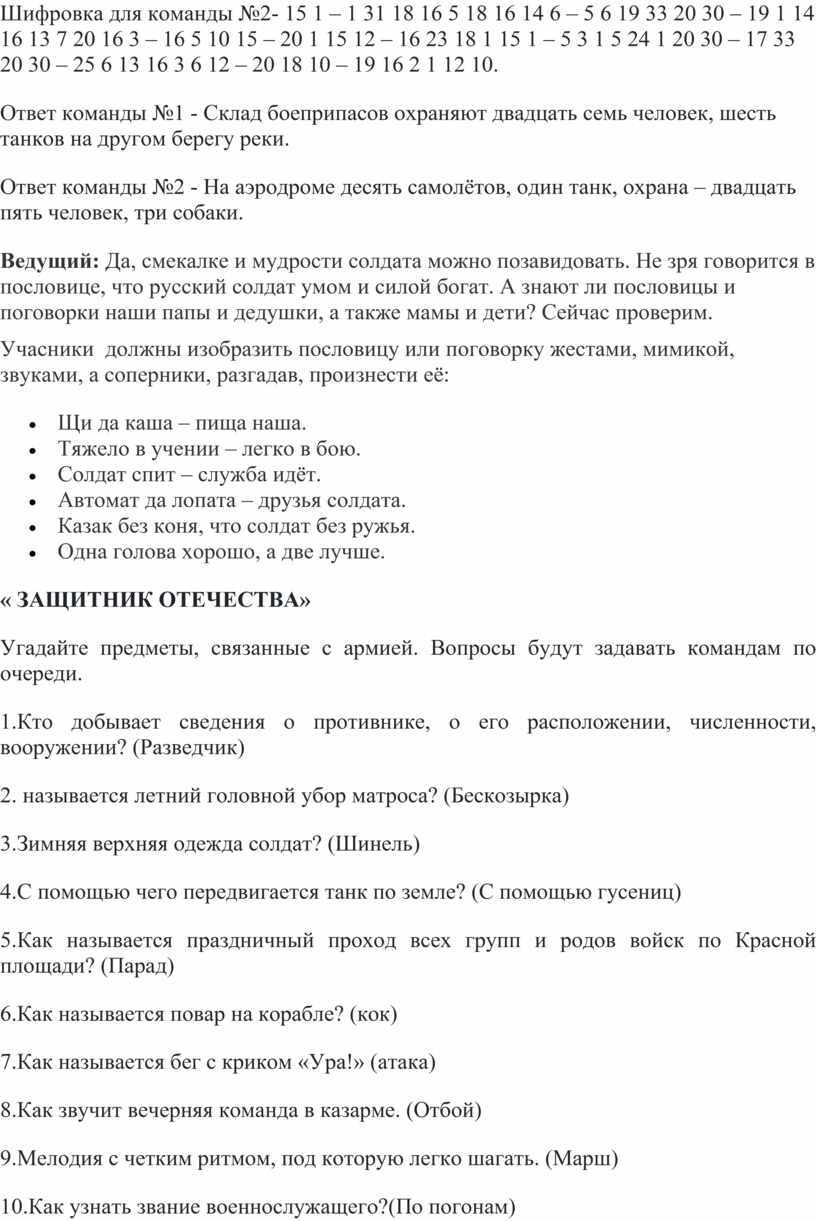 Ведущий: Да, смекалке и мудрости солдата можно позавидовать. Не зря говорится в пословице, что русский солдат умом и силой богат. А знают ли пословицы и поговорки наши папы и дедушки, а также мамы и дети? Сейчас проверим.