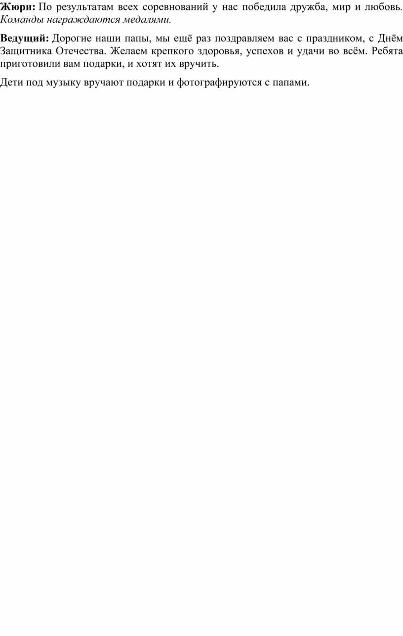 Ведущий: Дорогие наши папы, мы ещё раз поздравляем вас с праздником, с Днём Защитника Отечества. Желаем крепкого здоровья, успехов и удачи во всём. Ребята приготовили вам подарки, и хотят их вручить.