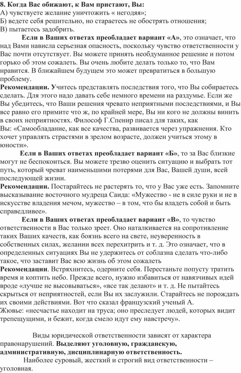 Если в Ваших ответах преобладает вариант «В», то чувство ответственности в Вас только зреет. Оно наталкивается на сопротивление таких Ваших качеств, как боязнь всего на свете, неуверенность в собственных силах, желании всех перехитрить и т. д. Это означает, что в определенных ситуациях Вы не удержитесь от соблазна сделать что-либо такое, что заставит Вас всю жизнь об этом сожалеть