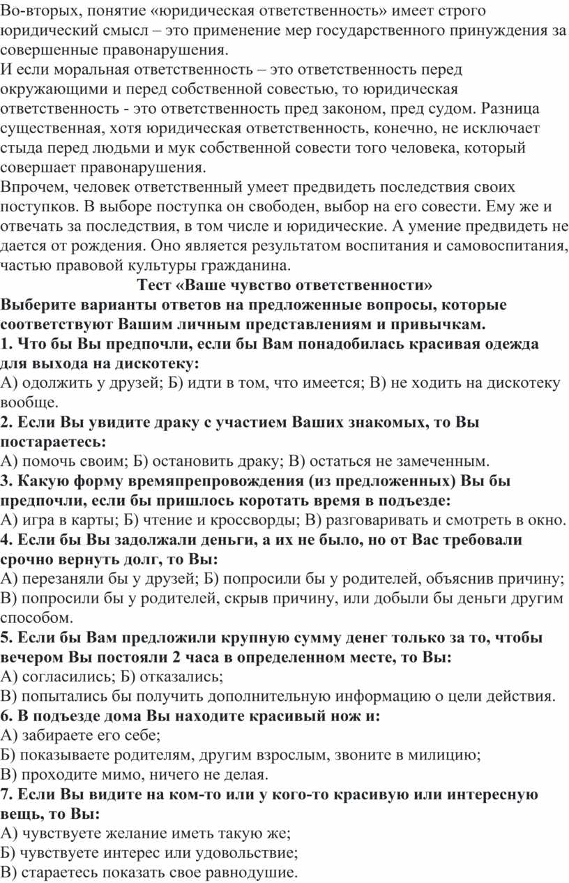 Впрочем, человек ответственный умеет предвидеть последствия своих поступков. В выборе поступка он свободен, выбор на его совести. Ему же и отвечать за последствия, в том числе и юридические. А умение предвидеть не дается от рождения. Оно является результатом воспитания и самовоспитания, частью правовой культуры гражданина.