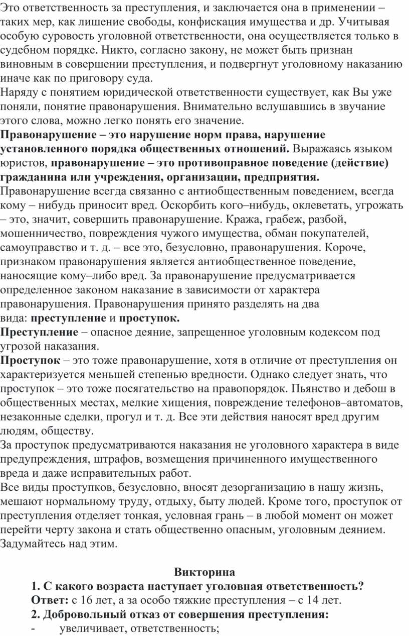 объяснить учащимся особенности юридической ответственности несовершеннолетних;