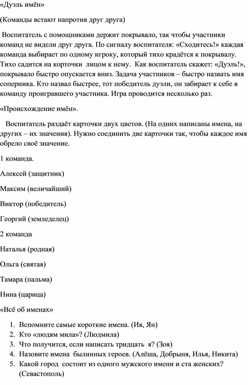 Воспитатель раздаёт карточки двух цветов. (На одних написаны имена, на других – их значения). Нужно соединить две карточки так, чтобы каждое имя обрело своё значение.
