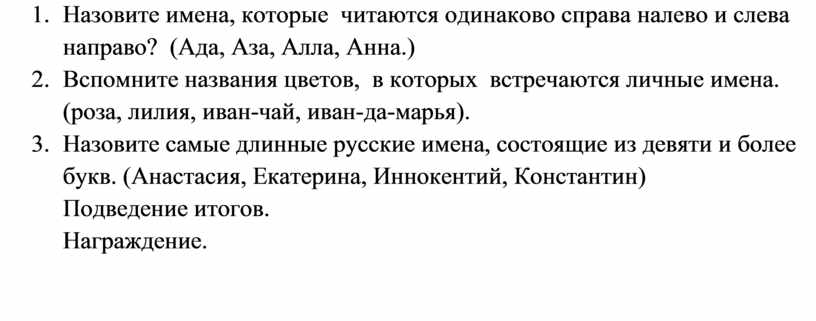 6. Назовите имена, которые читаются одинаково справа налево и слева направо? (Ада, Аза, Алла, Анна.)