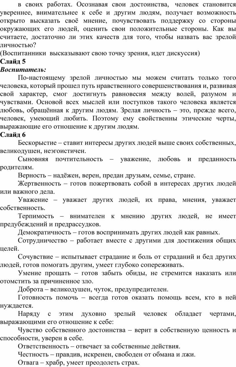 Наряду с этим духовно зрелый человек обладает чертами, выражающими его отношение к себе: