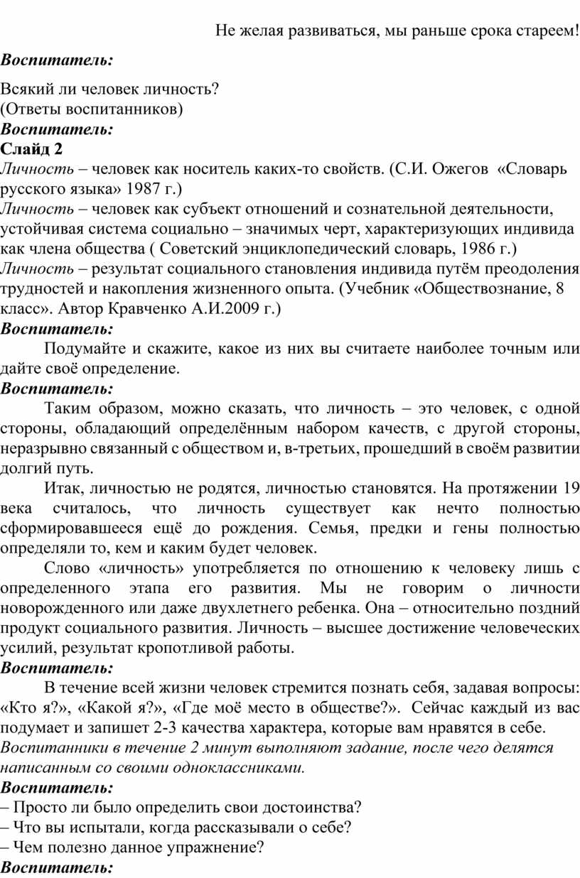 Слово «личность» употребляется по отношению к человеку лишь с определенного этапа его развития. Мы не говорим о личности новорожденного или даже двухлетнего ребенка. Она – относительно поздний продукт социального развития. Личность – высшее достижение человеческих усилий, результат кропотливой работы.