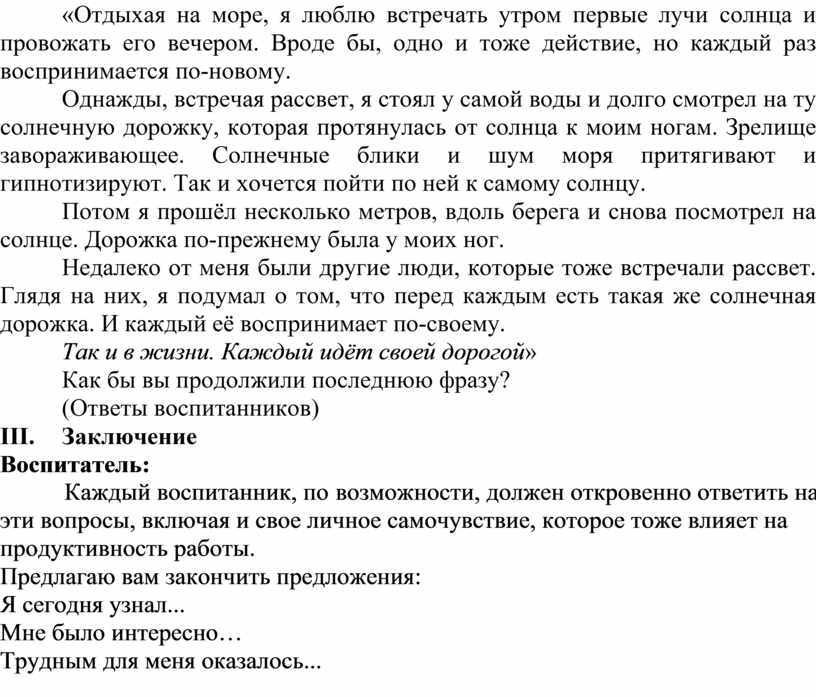 Каждый воспитанник, по возможности, должен откровенно ответить на эти вопросы, включая и свое личное самочувствие, которое тоже влияет на продуктивность работы.