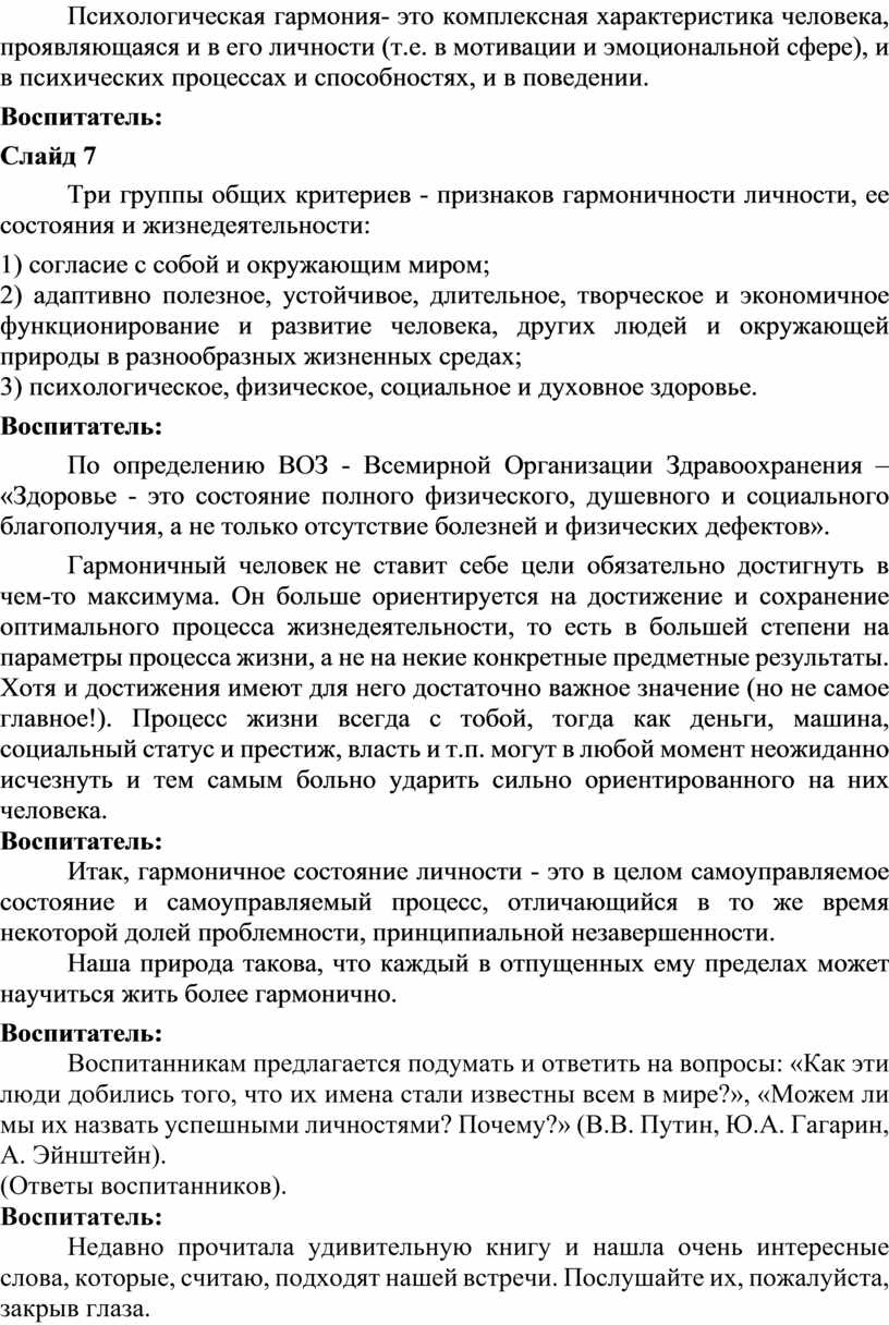 Психологическая гармония- это комплексная характеристика человека, проявляющаяся и в его личности (т.е. в мотивации и эмоциональной сфере), и в психических процессах и способностях, и в поведении.