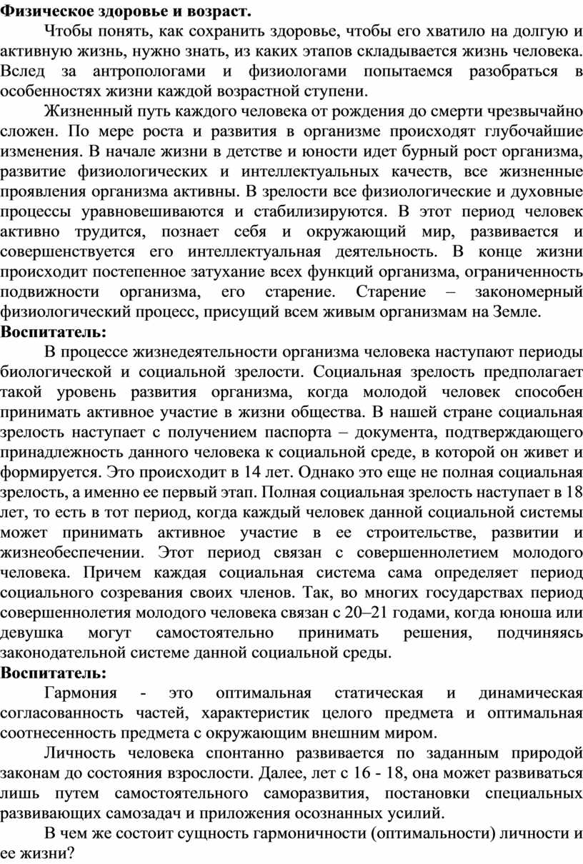 Жизненный путь каждого человека от рождения до смерти чрезвычайно сложен. По мере роста и развития в организме происходят глубочайшие изменения. В начале жизни в детстве и юности идет бурный рост организма, развитие физиологических и интеллектуальных качеств, все жизненные проявления организма активны. В зрелости все физиологические и духовные процессы уравновешиваются и стабилизируются. В этот период человек активно трудится, познает себя и окружающий мир, развивается и совершенствуется его интеллектуальная деятельность. В конце жизни происходит постепенное затухание всех функций организма, ограниченность подвижности организма, его старение. Старение – закономерный физиологический процесс, присущий всем живым организмам на Земле.