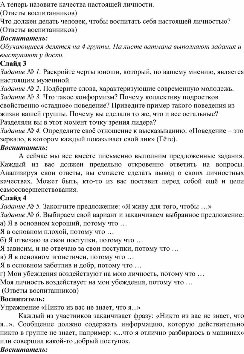 Задание № 1. Раскройте черты юноши, который, по вашему мнению, является настоящим мужчиной.