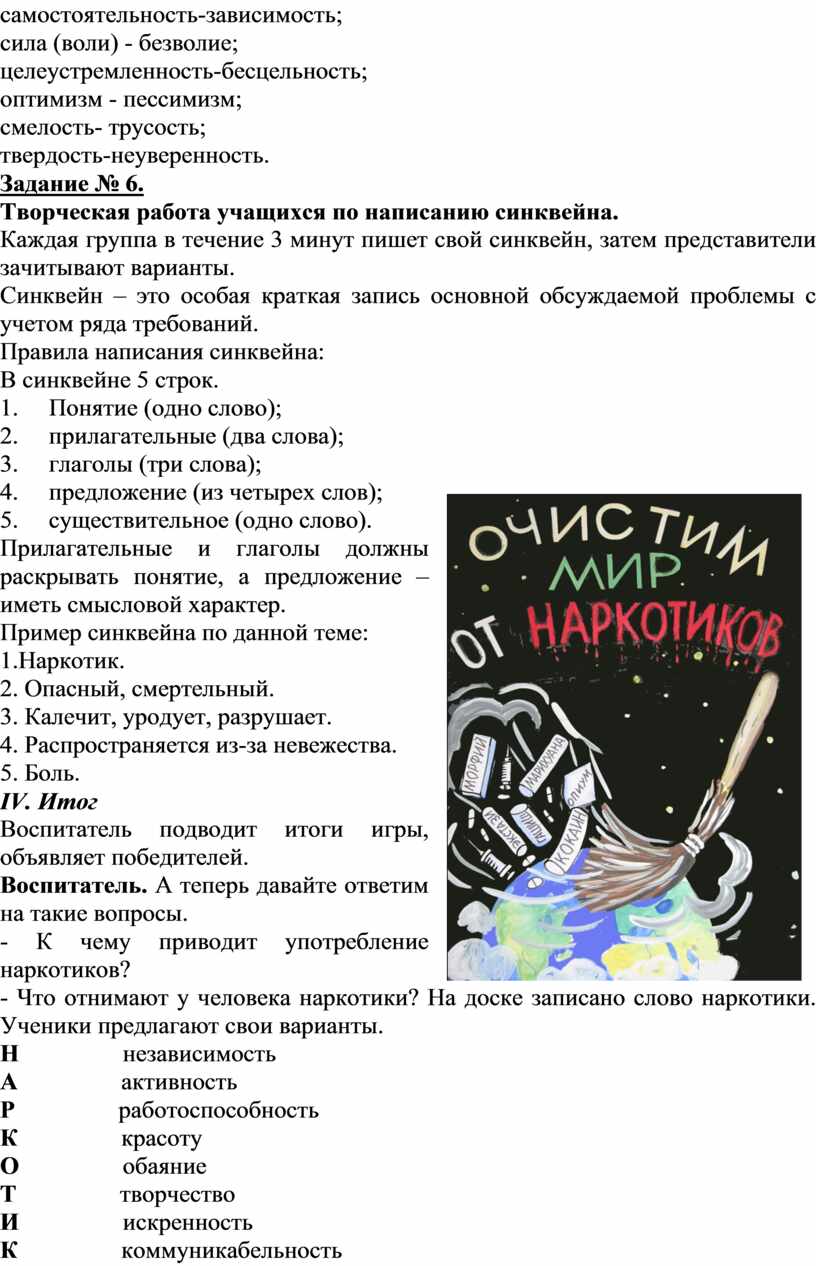 Командам раздаются карточки со словами. В течение 3 минут надо придумать и написать напротив слова-антонимы, связанные с проблемой наркомании.