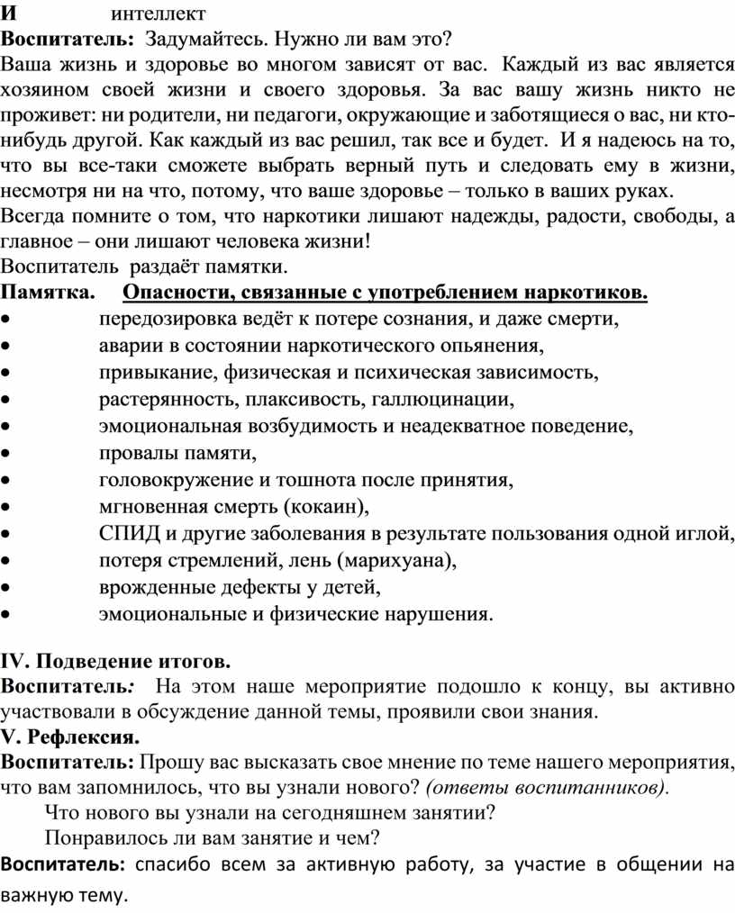 Цель: помочь воспитанникам осознать пагубное воздействие наркотиков и последствия их употребления.