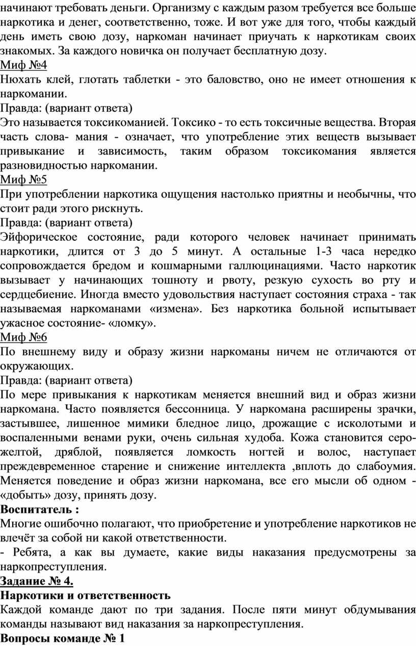 Каждой команде дают по три задания. После пяти минут обдумывания команды называют вид наказания за наркопреступления.