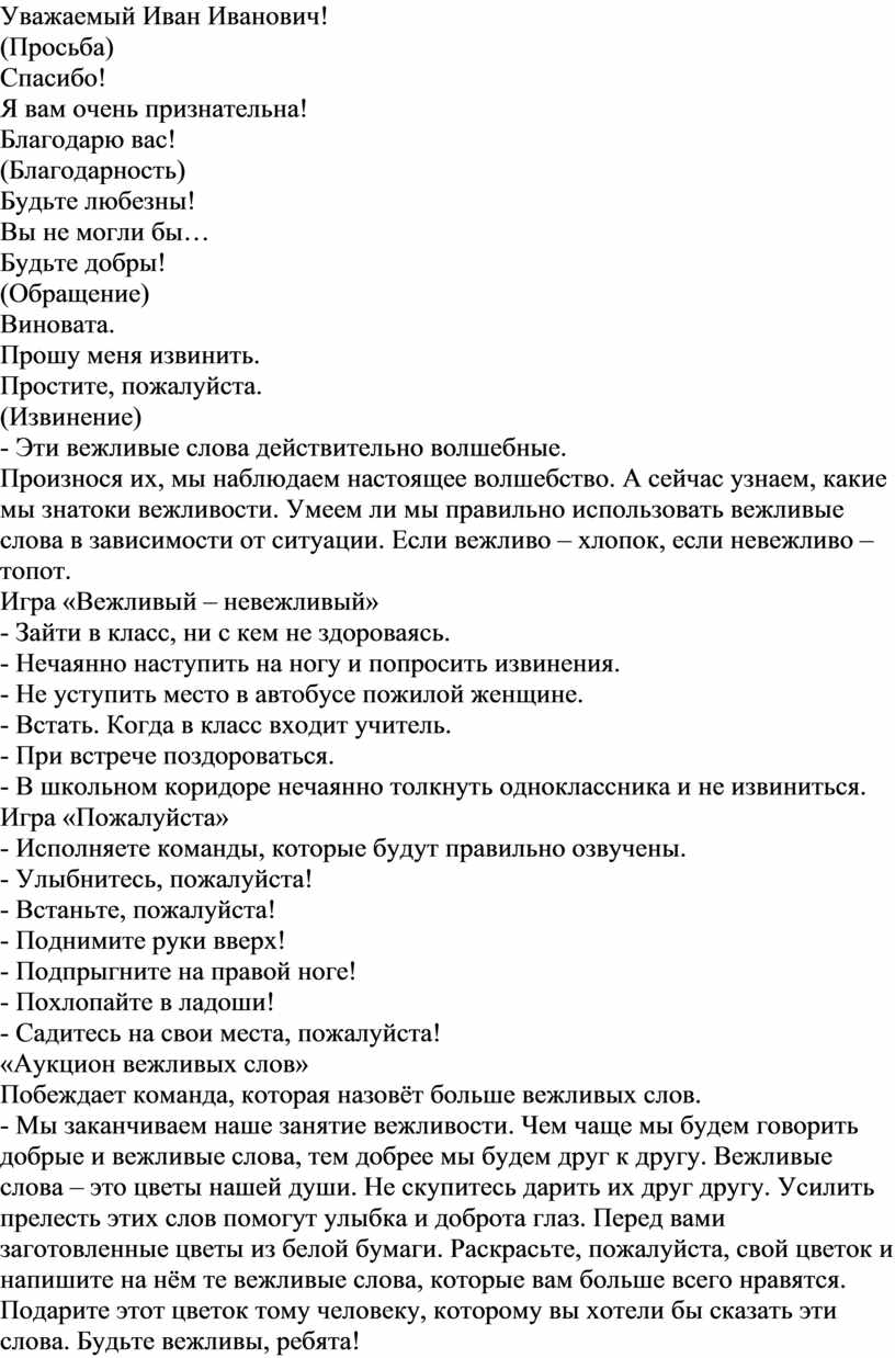 - Мы заканчиваем наше занятие вежливости. Чем чаще мы будем говорить добрые и вежливые слова, тем добрее мы будем друг к другу. Вежливые слова – это цветы нашей души. Не скупитесь дарить их друг другу. Усилить прелесть этих слов помогут улыбка и доброта глаз. Перед вами заготовленные цветы из белой бумаги. Раскрасьте, пожалуйста, свой цветок и напишите на нём те вежливые слова, которые вам больше всего нравятся. Подарите этот цветок тому человеку, которому вы хотели бы сказать эти слова. Будьте вежливы, ребята!