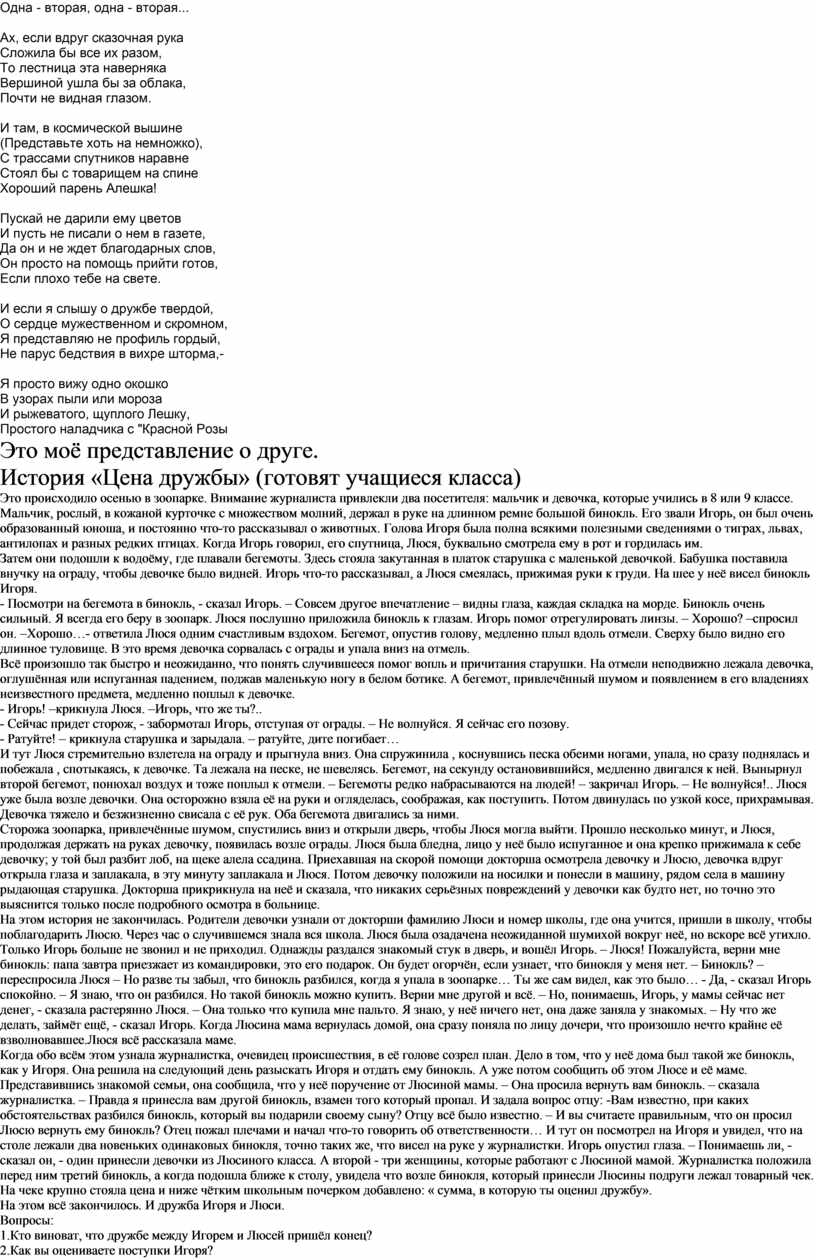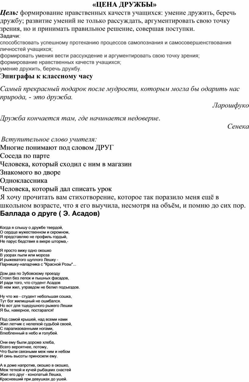 Цель: формирование нравственных качеств учащихся: умение дружить, беречь дружбу; развитие умений не только рассуждать, аргументировать свою точку зрения, но и принимать правильное решение, совершая поступки.