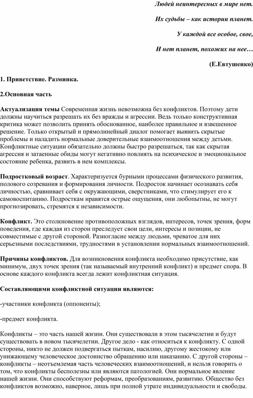 Актуализация темы Современная жизнь невозможна без конфликтов. Поэтому дети должны научиться разрешать их без вражды и агрессии. Ведь только конструктивная критика может позволить принять обоснованное, наиболее правильное и взвешенное решение. Только открытый и прямолинейный диалог помогает выявить скрытые проблемы и наладить нормальные доверительные взаимоотношения между детьми. Конфликтные ситуации обязательно должны быстро разрешаться, так как скрытая агрессия и затаенные обиды могут негативно повлиять на психическое и эмоциональное состояние ребенка, развить в нем комплексы.