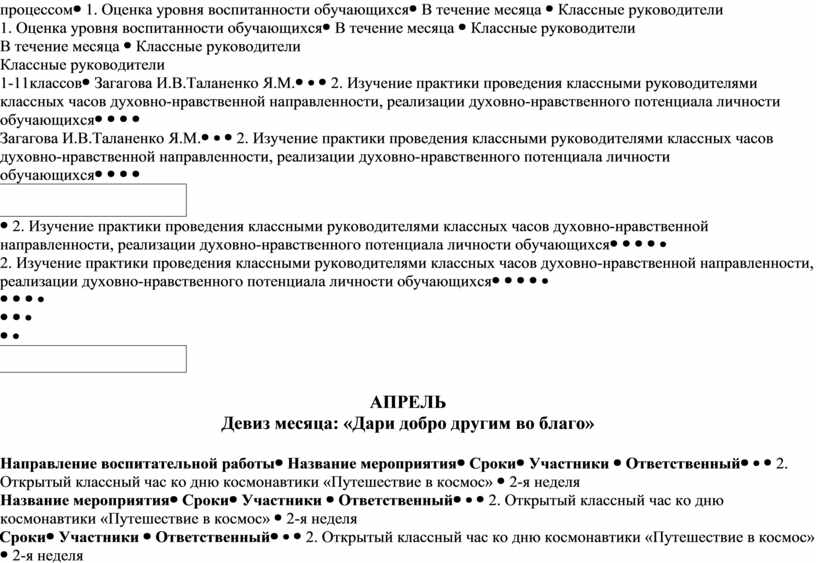 ПЛАН ВОСПИТАТЕЛЬНОЙ РАБОТЫ